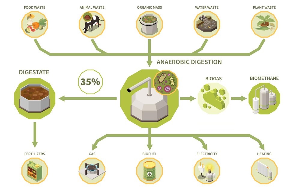 - Renewable Energy Source: Produced from agricultural waste, food waste, and organic matter.